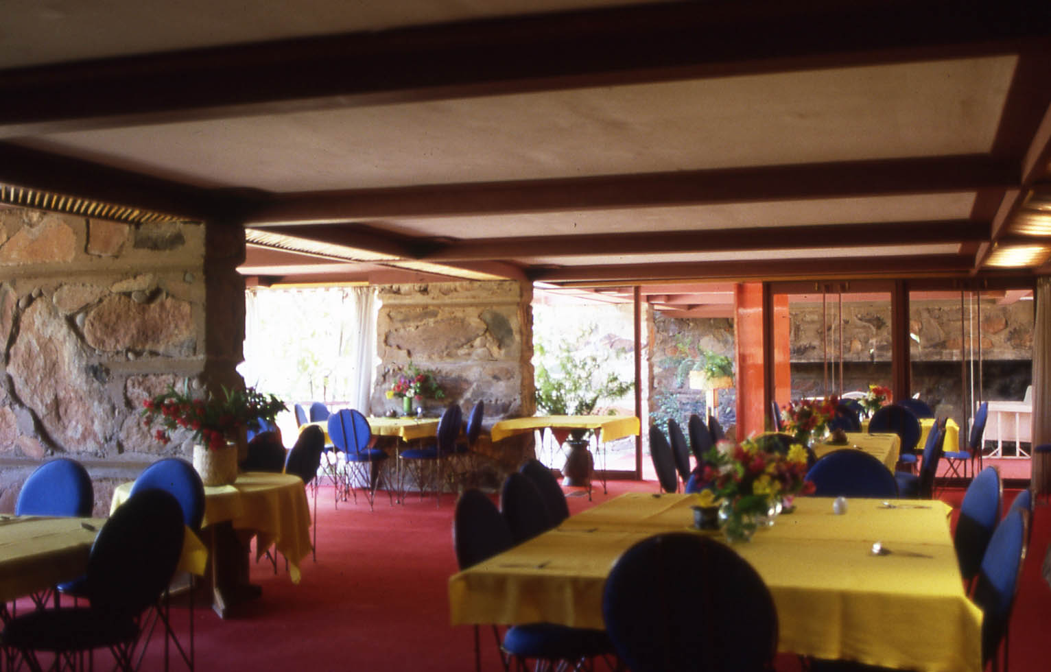 私がタリアセンに在籍していた時期は、ライトが亡くなった後ですが、ミセス・ライトはまだご健在で、ライトの家族、スタッフとその家族、私学生たち総勢70人が共同生活をしていました。掃除や食事作りなど全ての家事を交代で行います。キッチンは製図室とドア一枚の隣にあり、スタッフと学生の3人で70人分の食事(3食+午前と午後の2回のおやつ、計5食/1日)を作ります。キッチン当番は、朝から晩までのきつい仕事なので、キッチンの一週間は、製図室の仕事は免除されていました。ダイニング当番は、テーブルの配置を換え、テーブルクロスの色を選び、花を生けることが仕事です。全員が調理やおもてなし方を体験するのです。“体験が、リアリティのある提案を生む!”とのライトの考え方です。