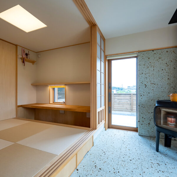 奥には和室小上がりと薪ストーブがある