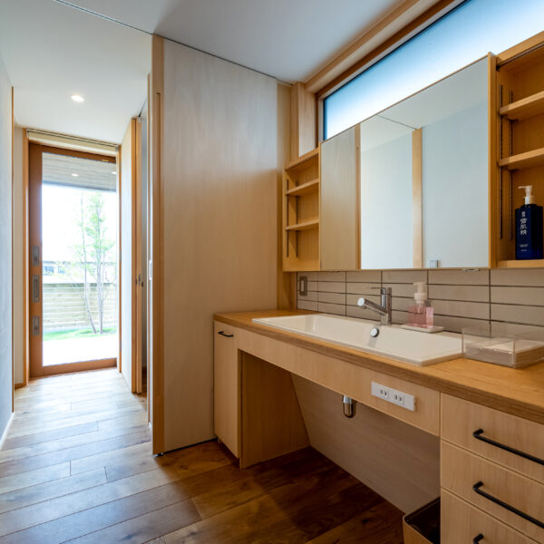 浴室・脱衣室・洗面所・トイレ・外物干し場と間仕切りの引き戸を開けると無駄のない一筆書き動線