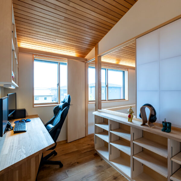 吹抜に面した2階に書斎を設けている