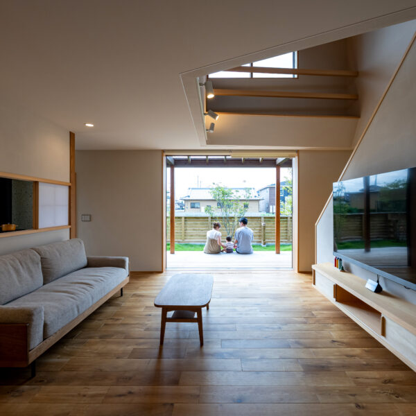 南庭に面した吹抜のある開放的でゆったりとしたリビング