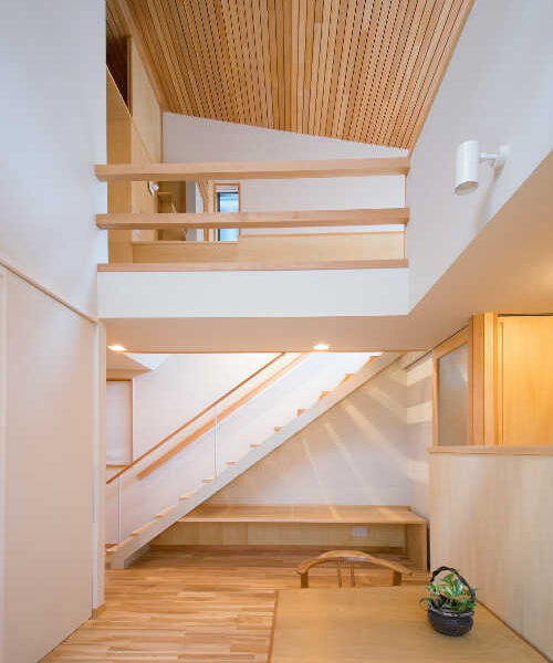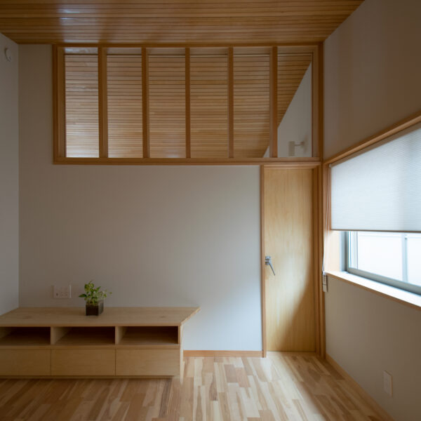 2階ホール。天井は吸音効果のある小幅板天井です。