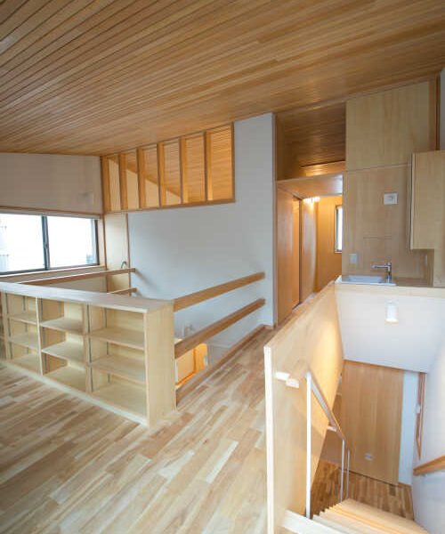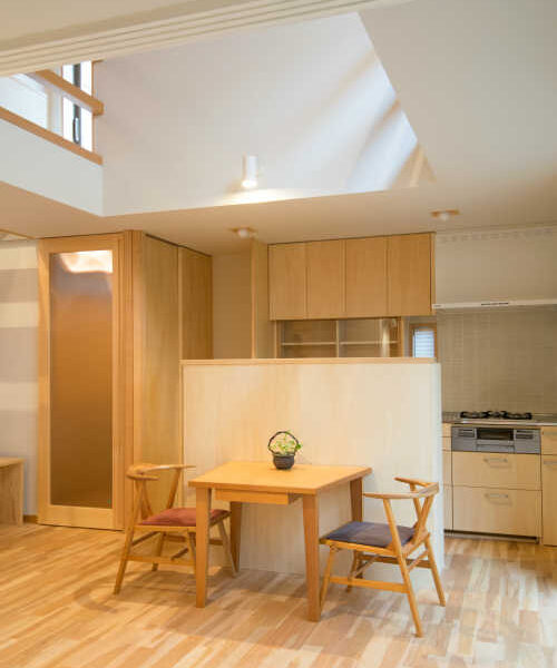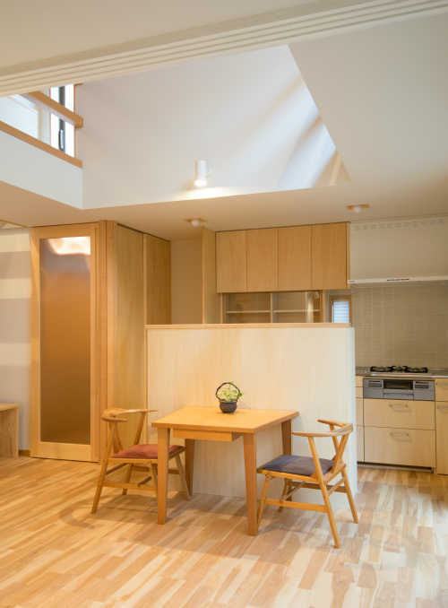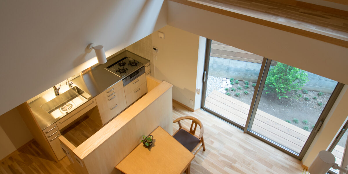 吹き抜けを設けて採光を確保。コンパクトなキッチンは、家具屋さんで作りました。
