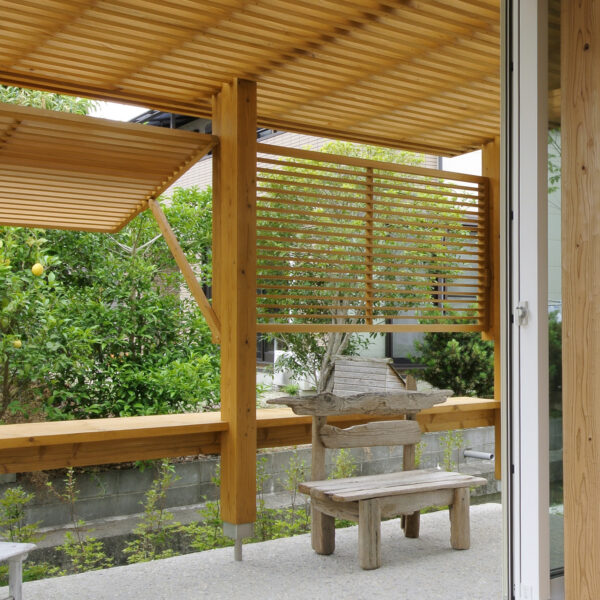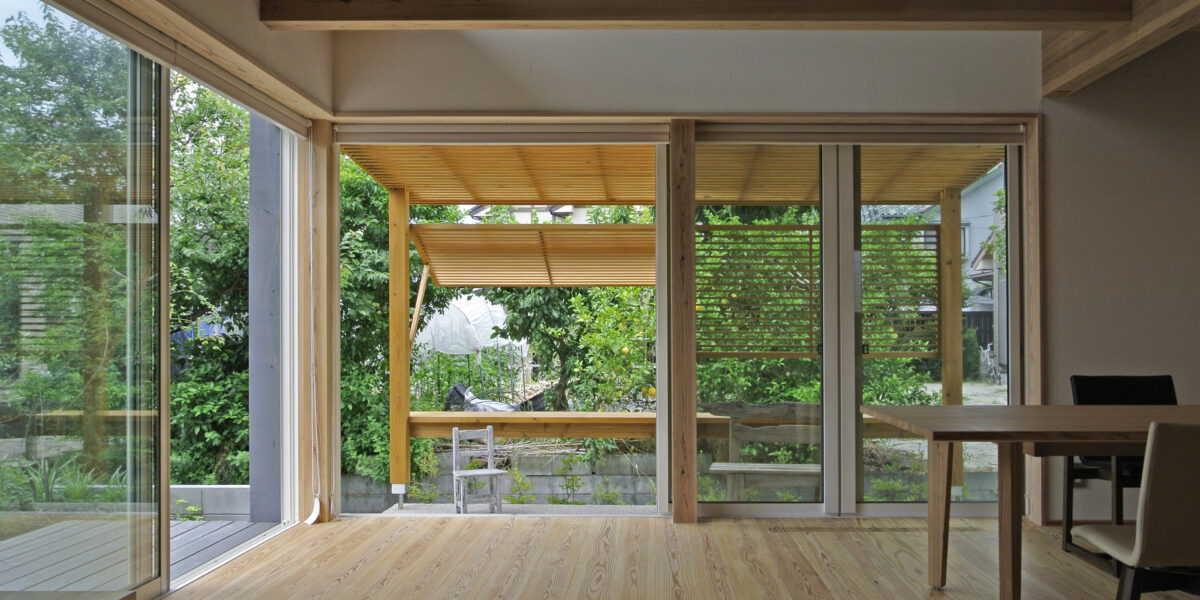 敷地の西側は、水路を隔てて隣家の緑が広がっている。それを借景として取り込んだ。問題は西日対策である。西側にサンルームを設け、木製ルーバーによる蔀戸(シトミド)を設置した。ルーバーの角度が変えられる簡単な仕掛けである。日差しを遮りながら風も視界も抜けることができる。