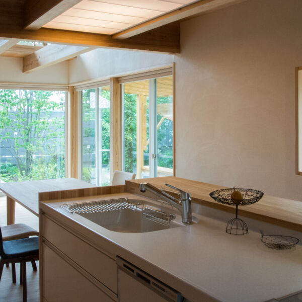 カウンターキッチンの正面には、小さな飾り窓がある。窓先にはアオダモを植えた。夏の日よけだけでなく、春の新緑、秋の紅葉が楽しみだ。右手に見えるグリーンのストライプは、駐車スペース。