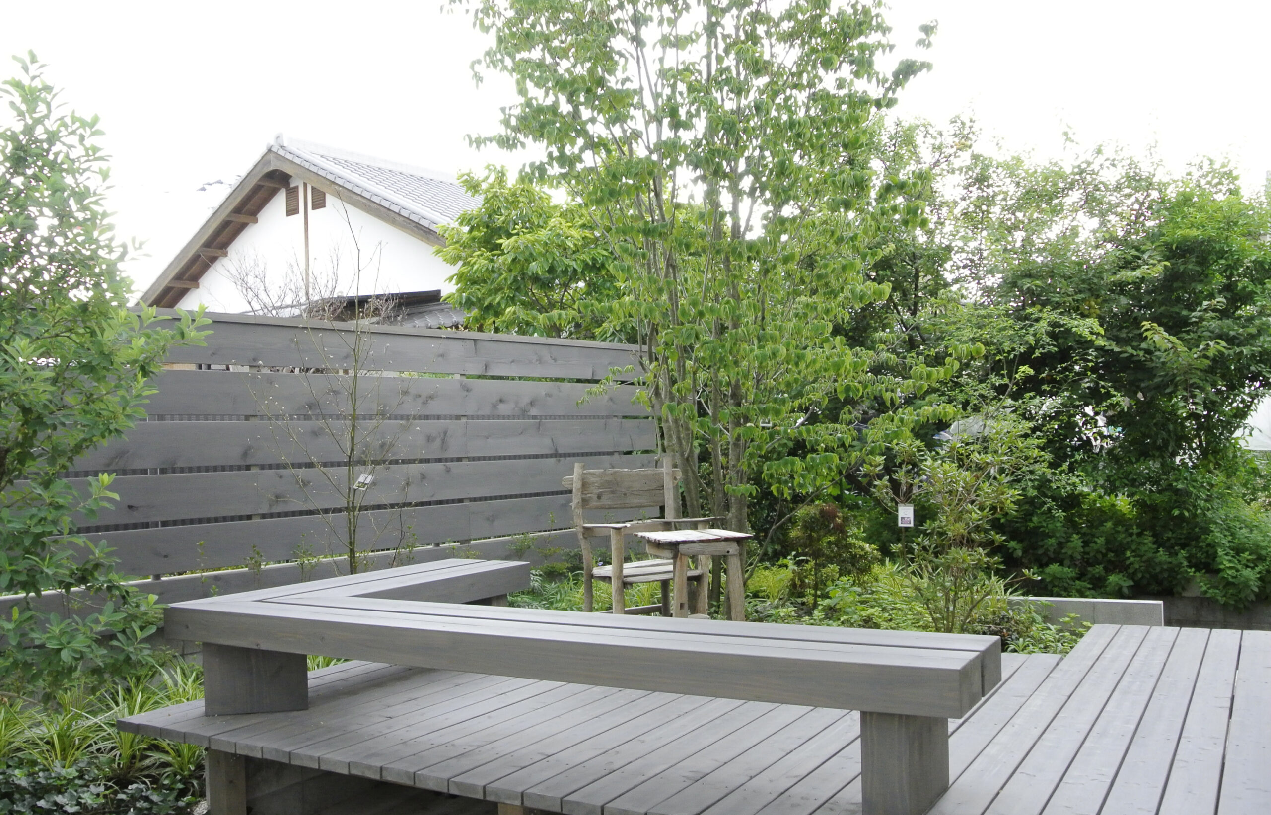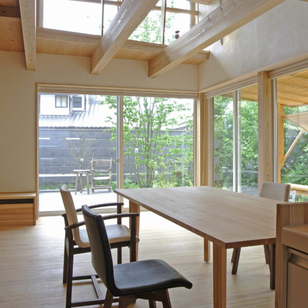 1階は、吹き抜けとコーナーの大きな開口部のあるワンルームである。冬は食堂の奥まで日が差し込む。食卓から樹木の幹から梢まで眺めることができる、伸びやかな空間である。戸外は、奥行きのあるウッドデッキ、木陰でのんびり楽しめるスペース。