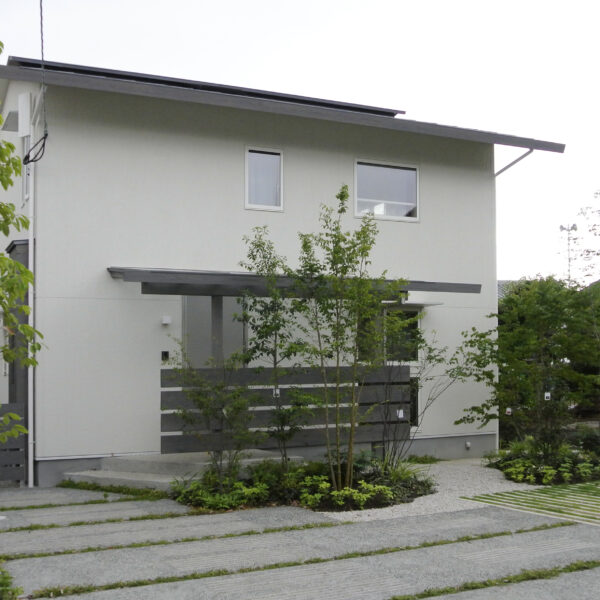 地方での生活は、駐車場は最低2台、来客のことを考えると3台分ほしくなる。これを舗装してしまうと夏の照り返しは相当なものだ。帯状に緑化して緑のスペースを増やした。