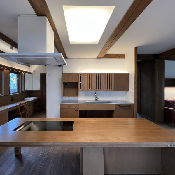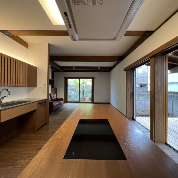 正面の対面キッチンと手前の畳は撤去、テラスに面する掃き出し窓は引込に取り替えました。