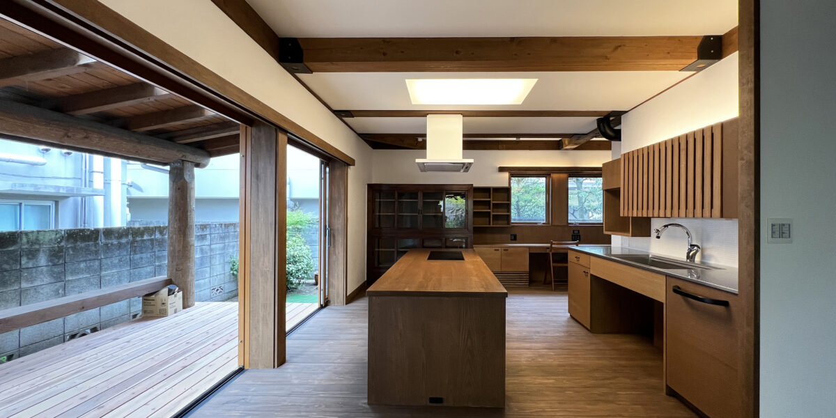 大きな引込戸を開けると、ダイニングキッチンと既存の屋根付きのデッキが一体化します。
