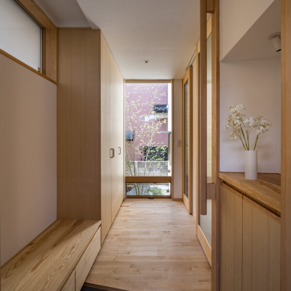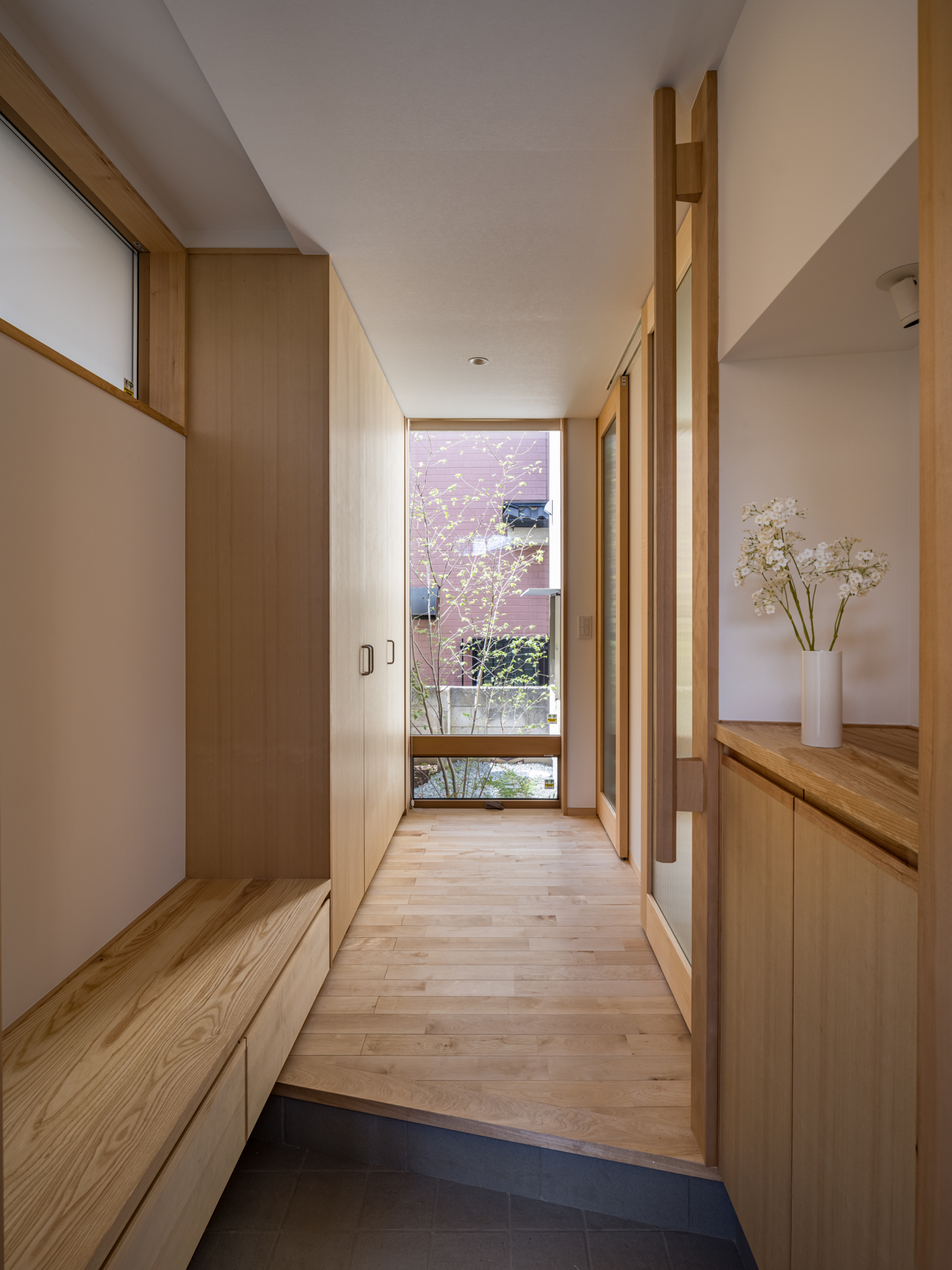 玄関扉を開けると真正面に坪庭の緑が目に入ります。