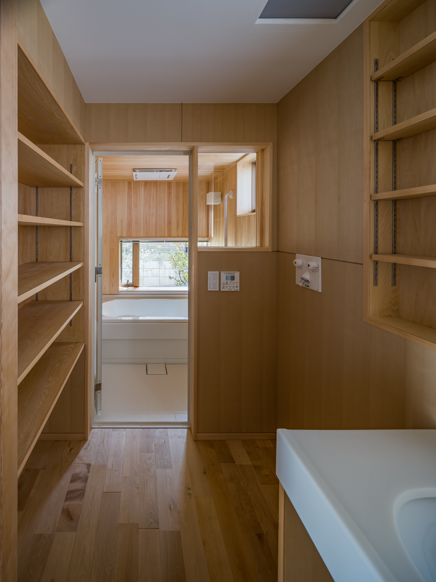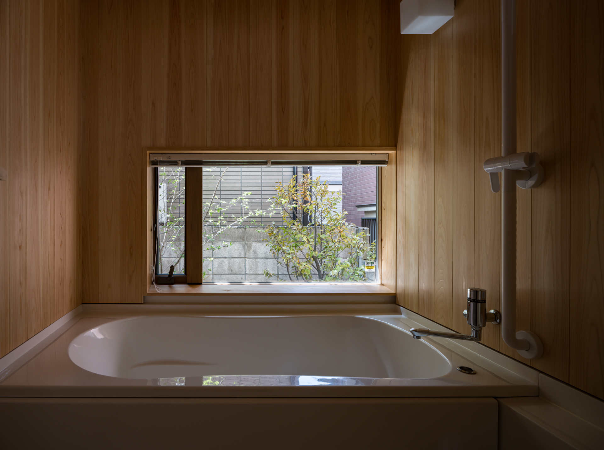 浴槽はハーフユニットバス、壁天井を桧縁甲板張りにしています。