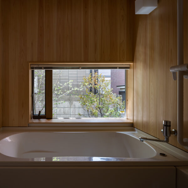 隣家の窓とバッティングしないように坪庭を設け、ちょっとした温泉気分を味わえます。玄関ホールの窓からもこの坪庭を共有しています。