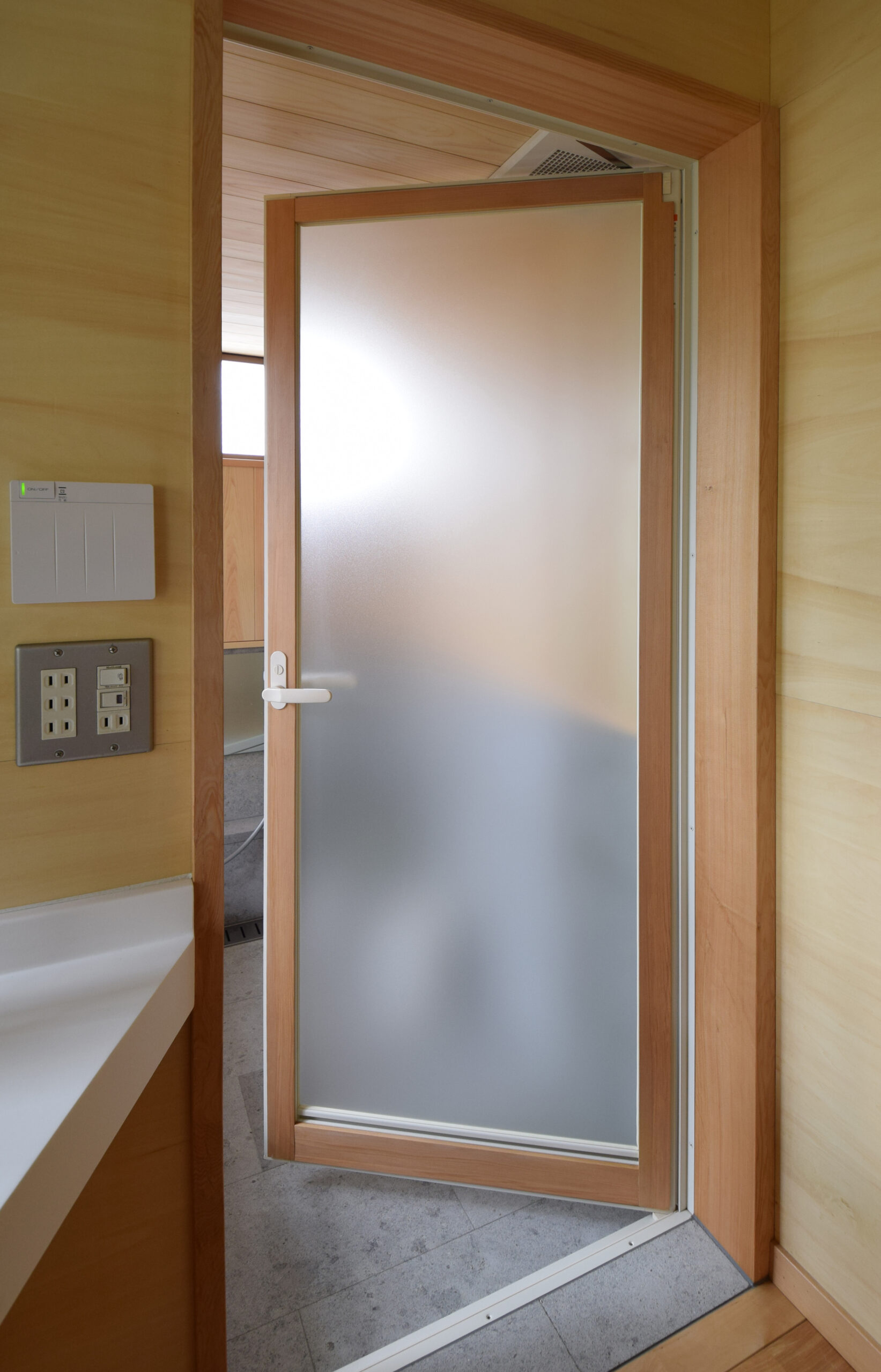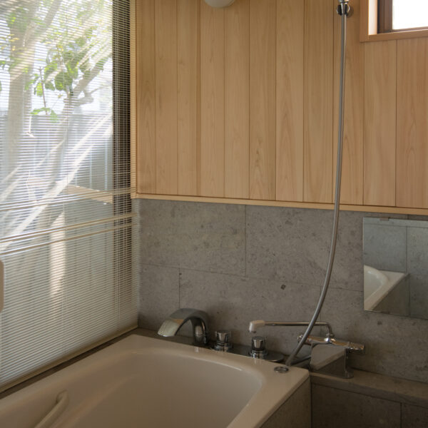 床と腰壁には天然石、壁と天井は桧、脱衣室側の浴室ドア框は木製としました。