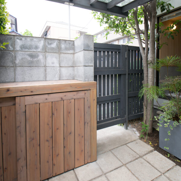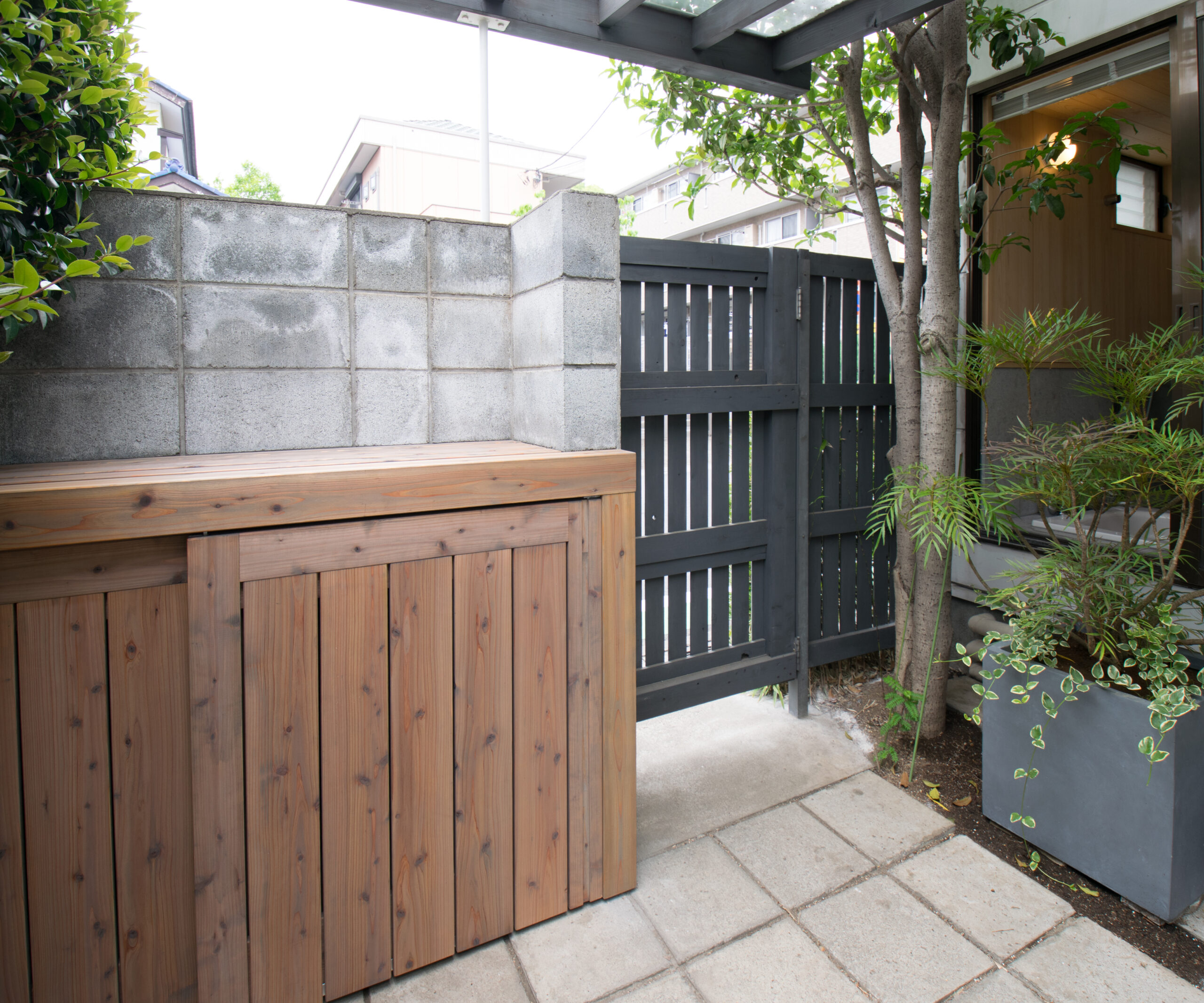 オイルタンクを撤去して木製のごみ置き場を設置し、緑も追加しました。
