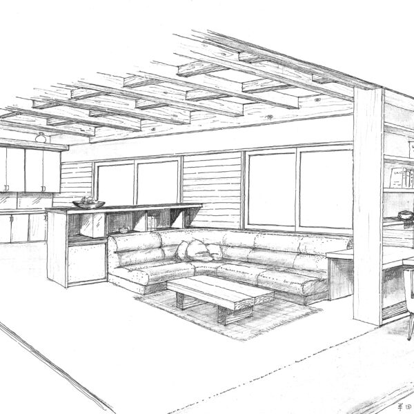 明治時代に建てられた養蚕小屋が、二度の移築を経て終戦後両親の自宅となり、私の最初の設計がこの家のリフォームでした。遠藤楽建築創作所に奉職中でしたが、恩師である遠藤先生がパースを描いてくれました。たくさんの記憶が詰まったこの家を解体し構造材を、グループホームの食堂の天井として、再活用させていただきました。