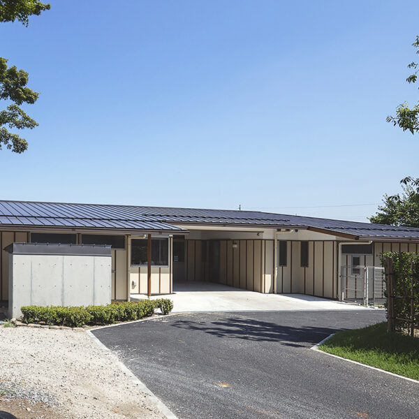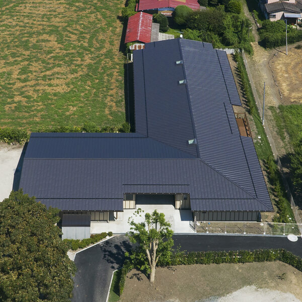 L字型の平屋。正面玄関左側が事務所や食堂、南向きの右側が居住エリア。