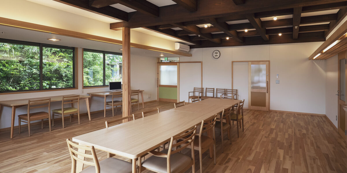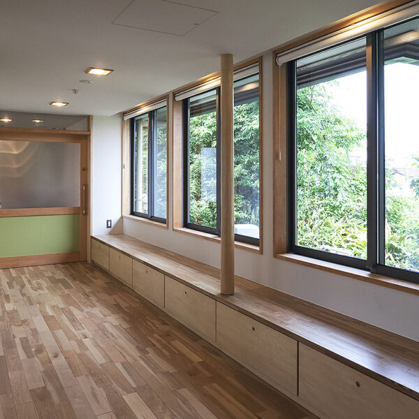 お迎えのバスを待つ時間や食事前の団欒スペース。夏には東側の窓から爽やかな風が通り抜ける。
