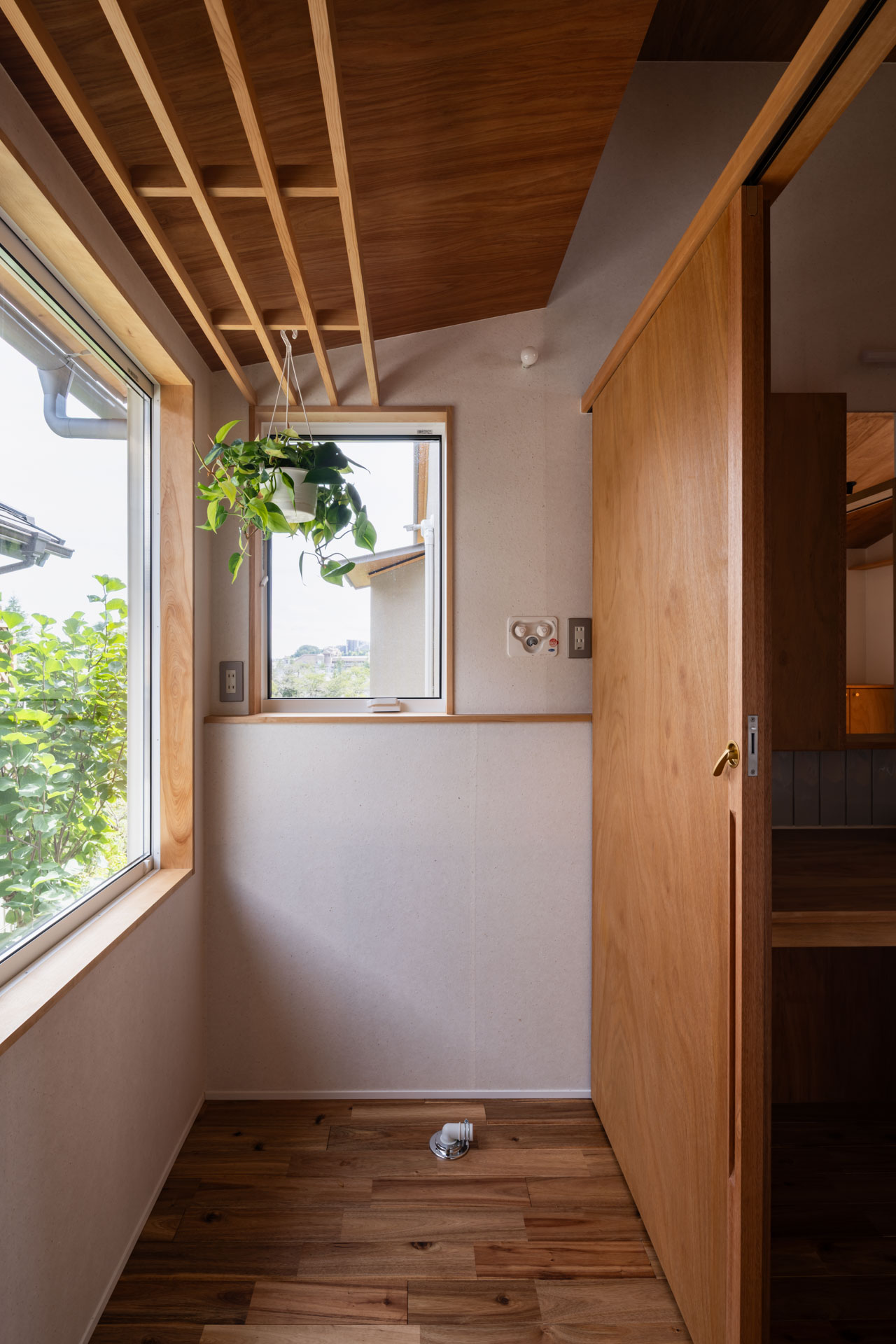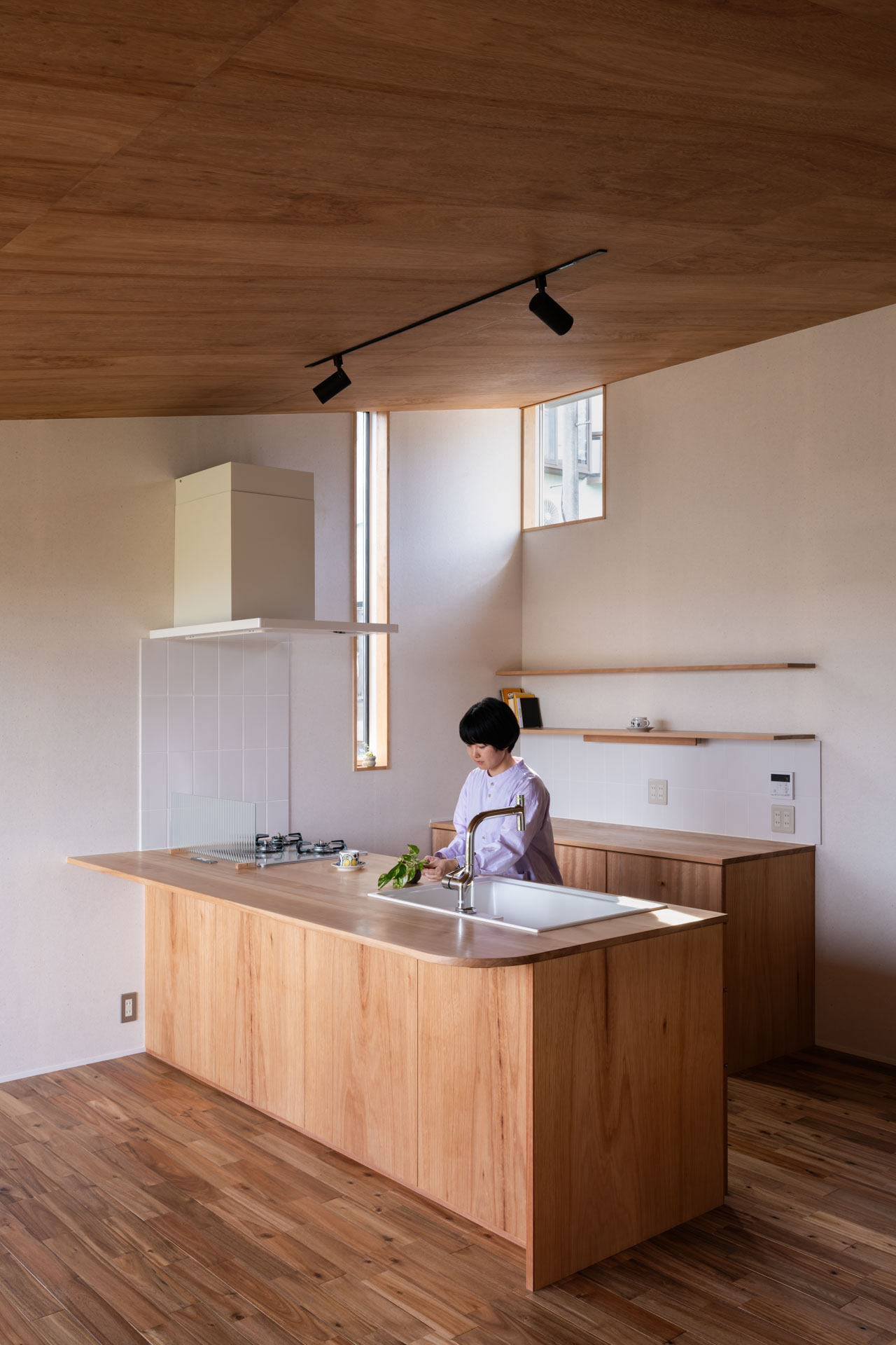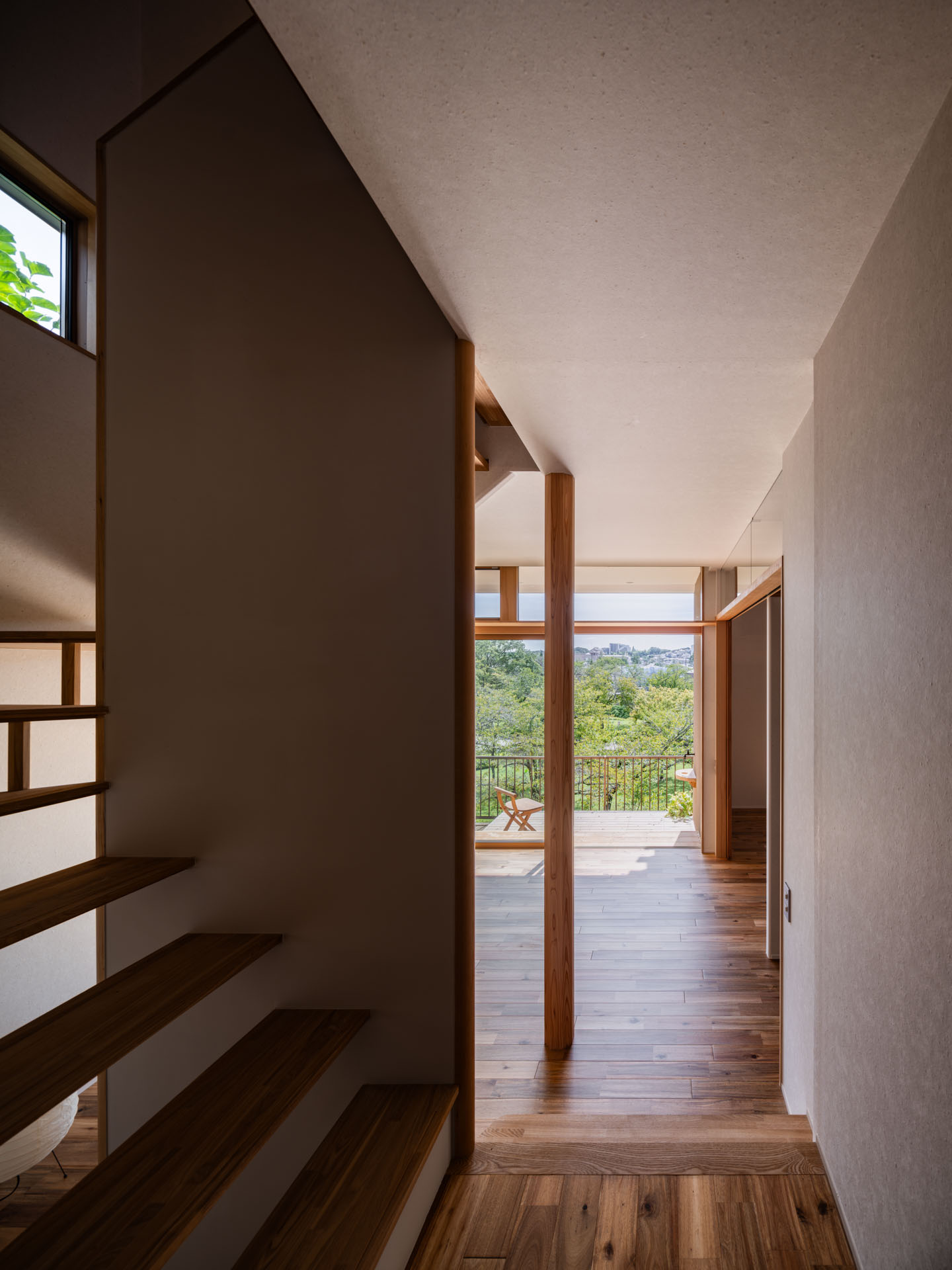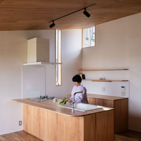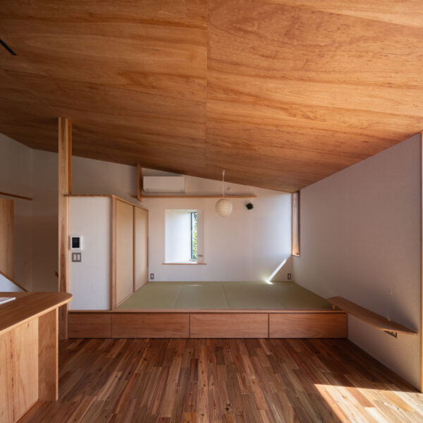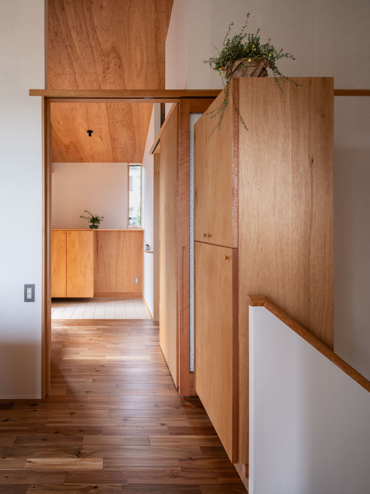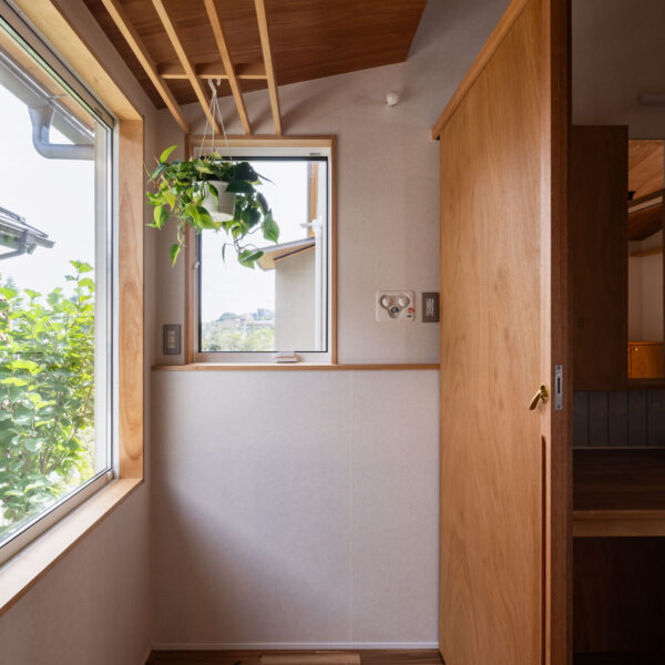 道路面から敷地面が3M 以上低いため、道路と同じレベルの2 階に玄関と水まわり、居間を設け、1 階を居室スペースとしました。
