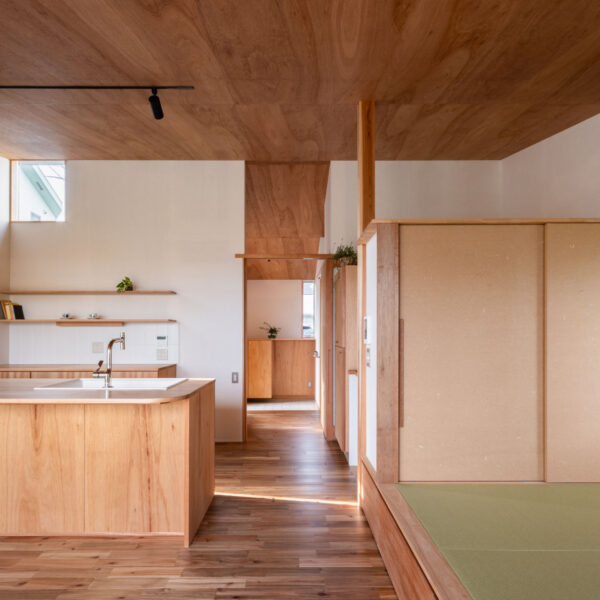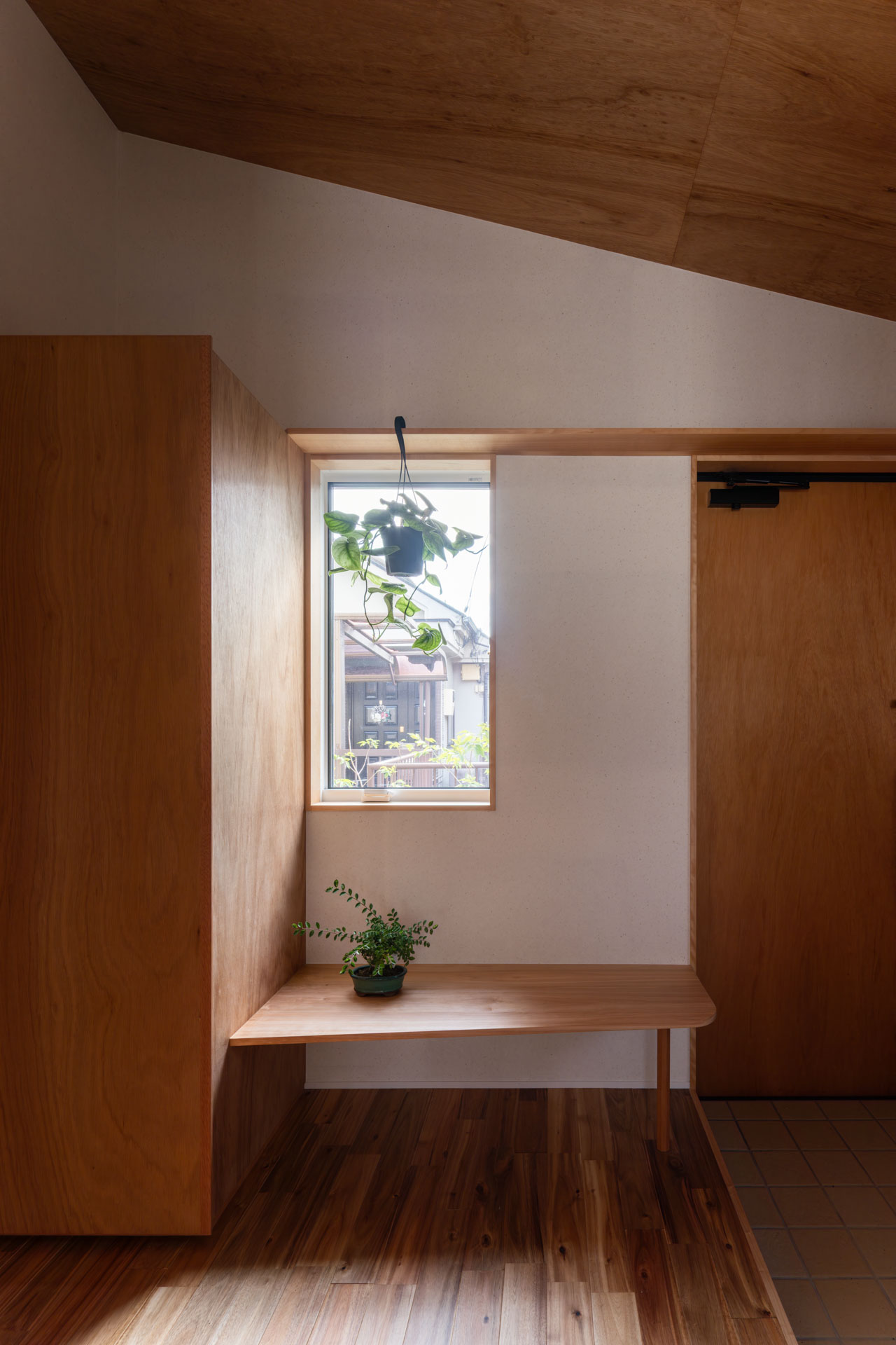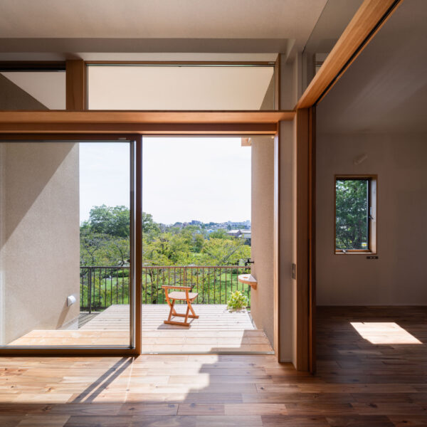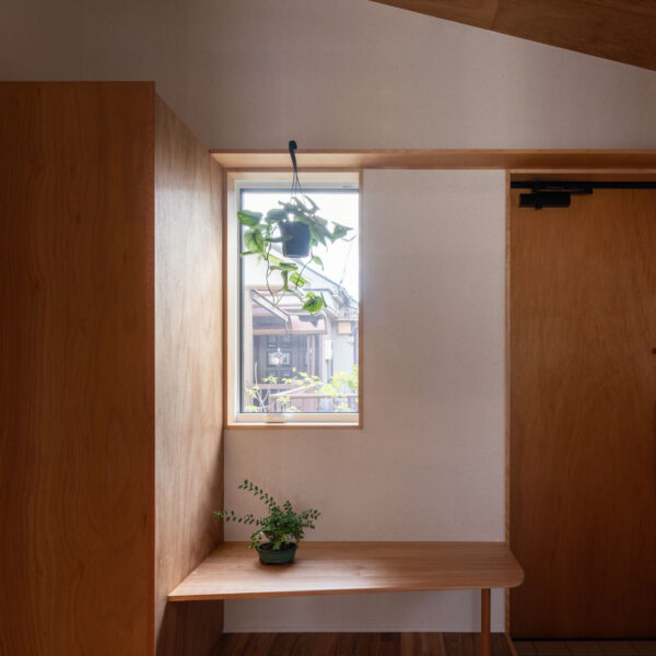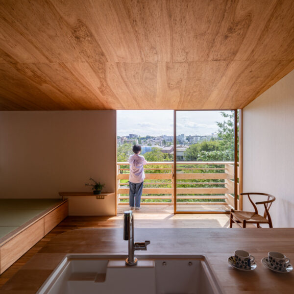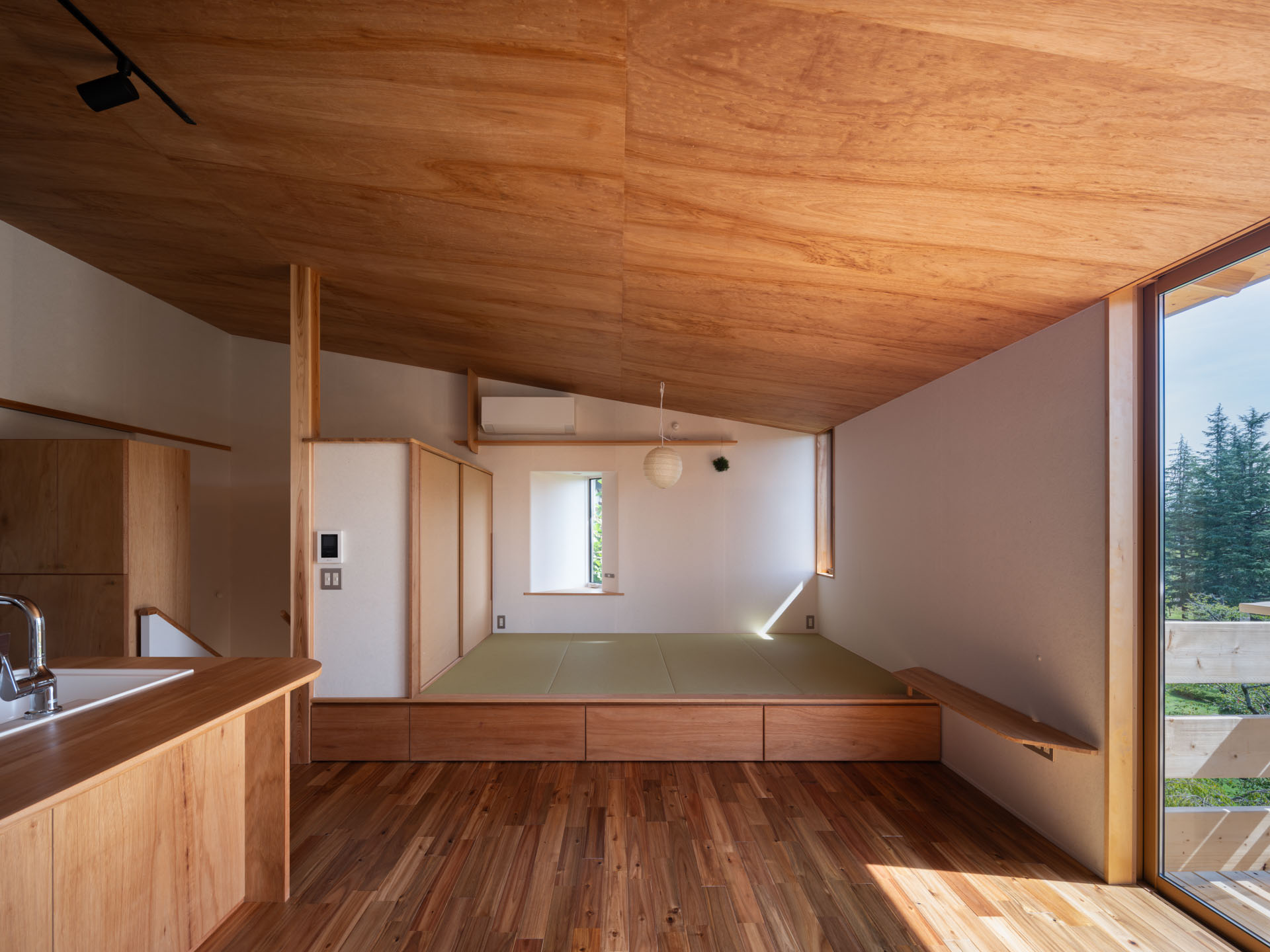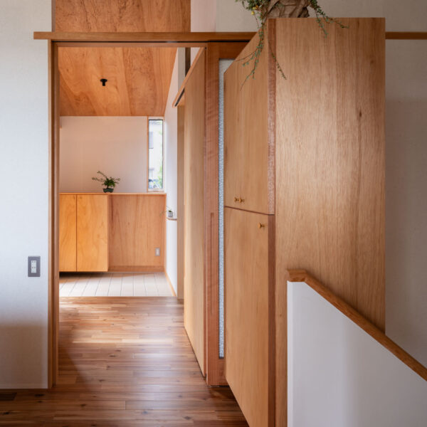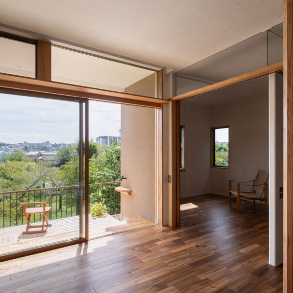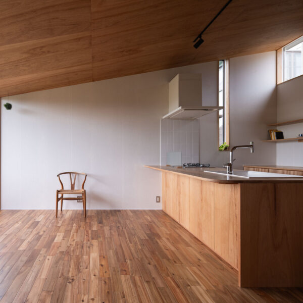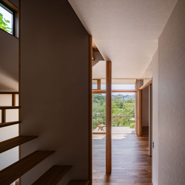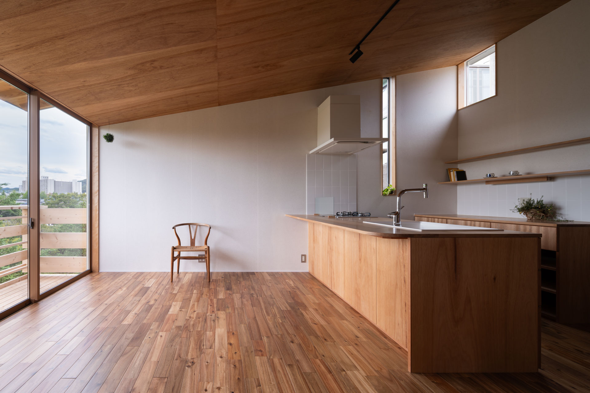 道路面から敷地面が3M 以上低いため、道路と同じレベルの2 階に玄関と水まわり、居間を設け、1 階を居室スペースとしました。