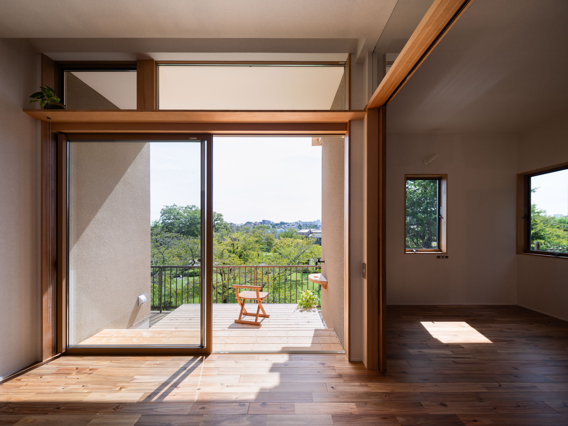住宅隣地側は開口部をできるだけ絞り、公園側は見え方が変わるように大小の開口を切り取り、抜け感を意識しています。